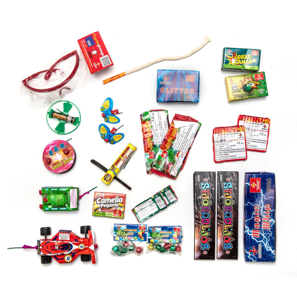 Stubba kassi fullur af smádóti. Helmingi minni en Trítill. Ein öryggisgleraugu fyrir börn.